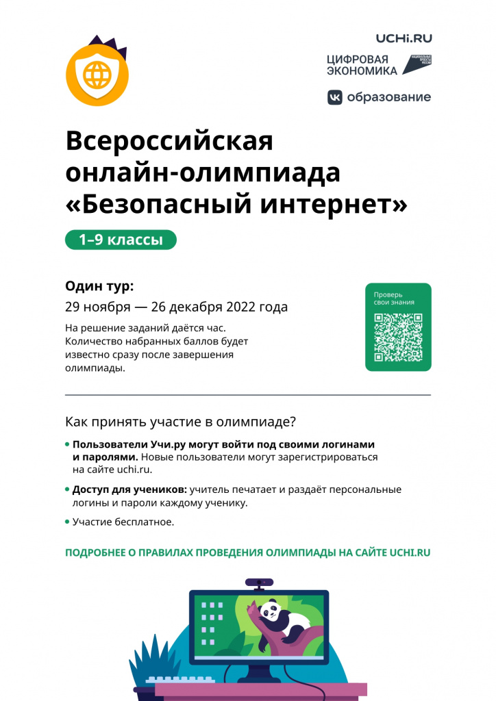 В поддержку задач национального проекта «Цифровая экономика» по воспитанию ИТ-кадров и повышению цифровой грамотности населения 29 ноября 2022 года стартует Всероссийская онлайн-олимпиада для школьников 1-9 классов «Безопасный интернет» (далее - Олимпиада).
